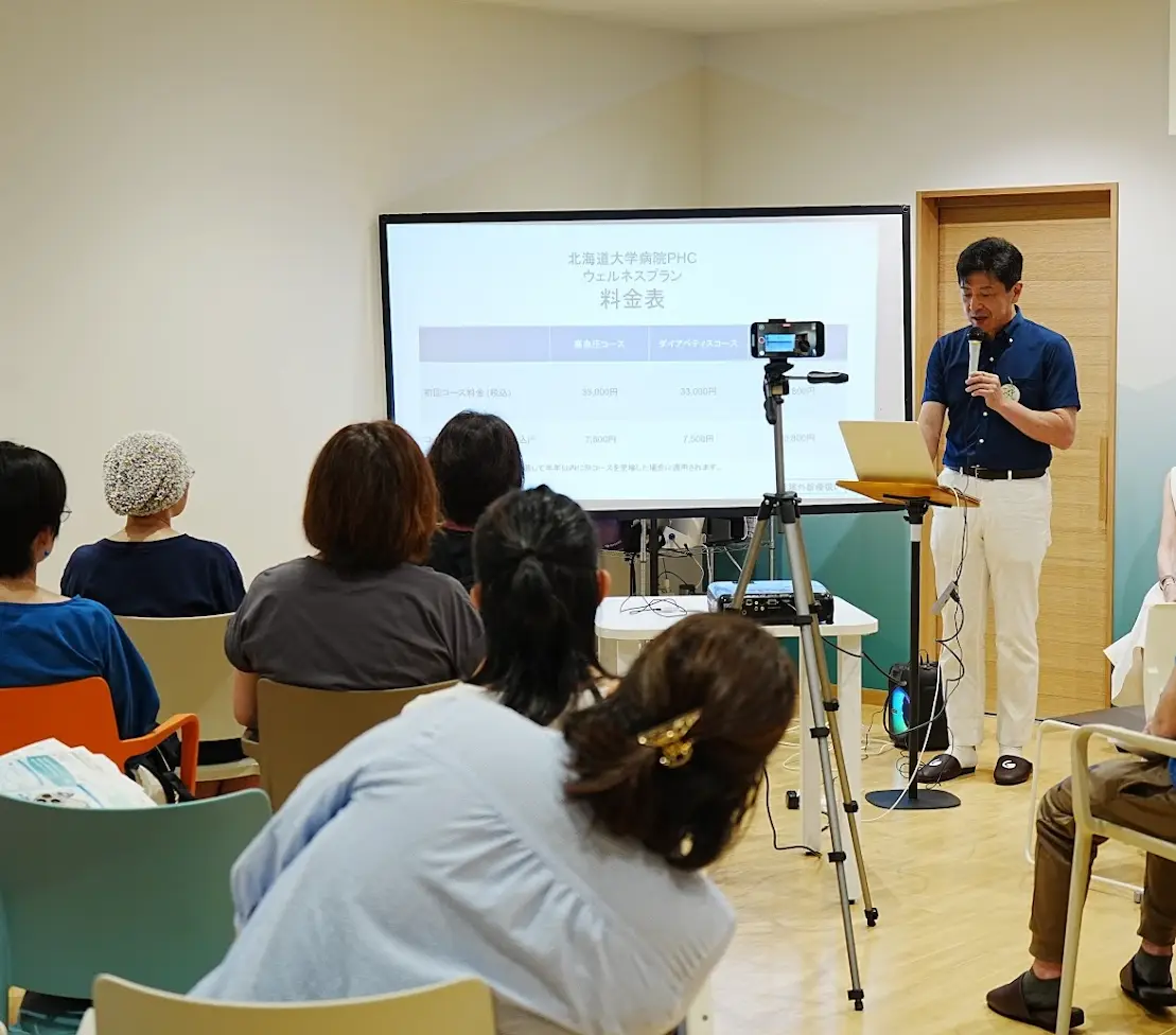 北海道大学病院パーソナルヘルスセンターと連携し、地域の方々へ「遺伝情報を知ることで自分の体質を理解し、健康を守る重要性」を伝えるセミナーを開催。遺伝子解析を活用した予防医療の啓発とともに、運動・栄養を組み合わせた健康づくりの啓蒙活動を続けています。今後は、解析結果を活用した運動指導の仕組みづくりにも取り組んでいきます。