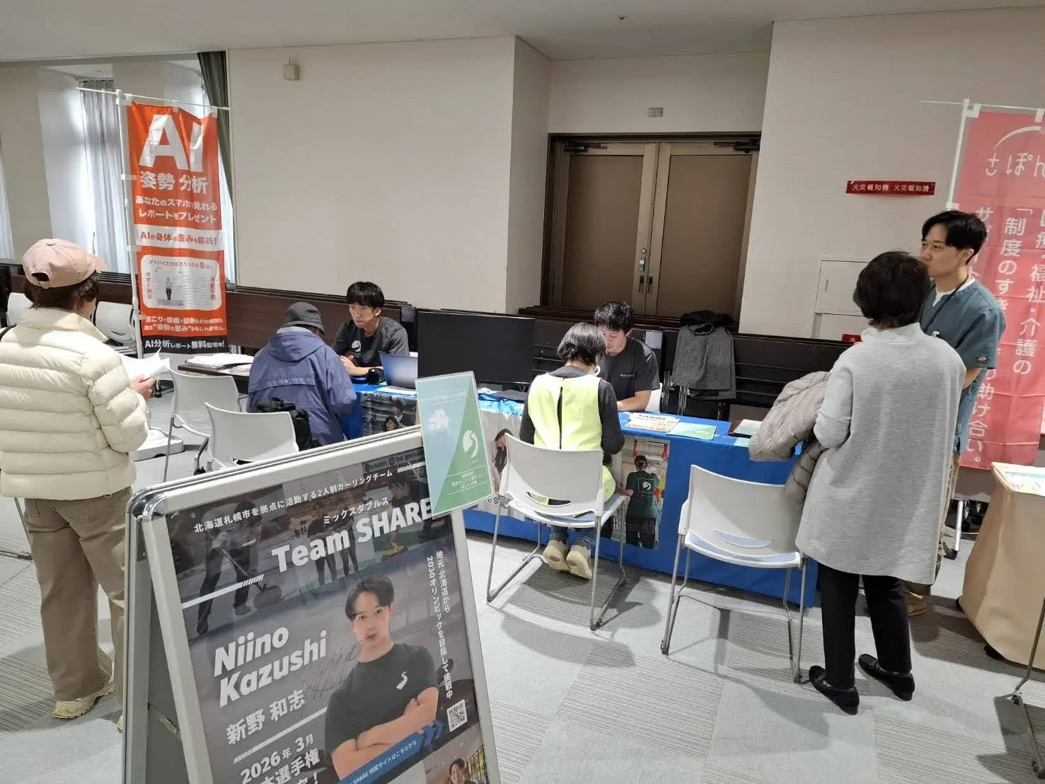 札幌の在福ネット「健康まつり」に、スマートライフリハ(以下、スマリハ)と南円山みんなの内科ハートクリニックが共催出店。AI姿勢分析と総合内科専門医の健康相談を同時体験できるブースを展開し、姿勢への関心の高さから終日空き待ちとなりました。