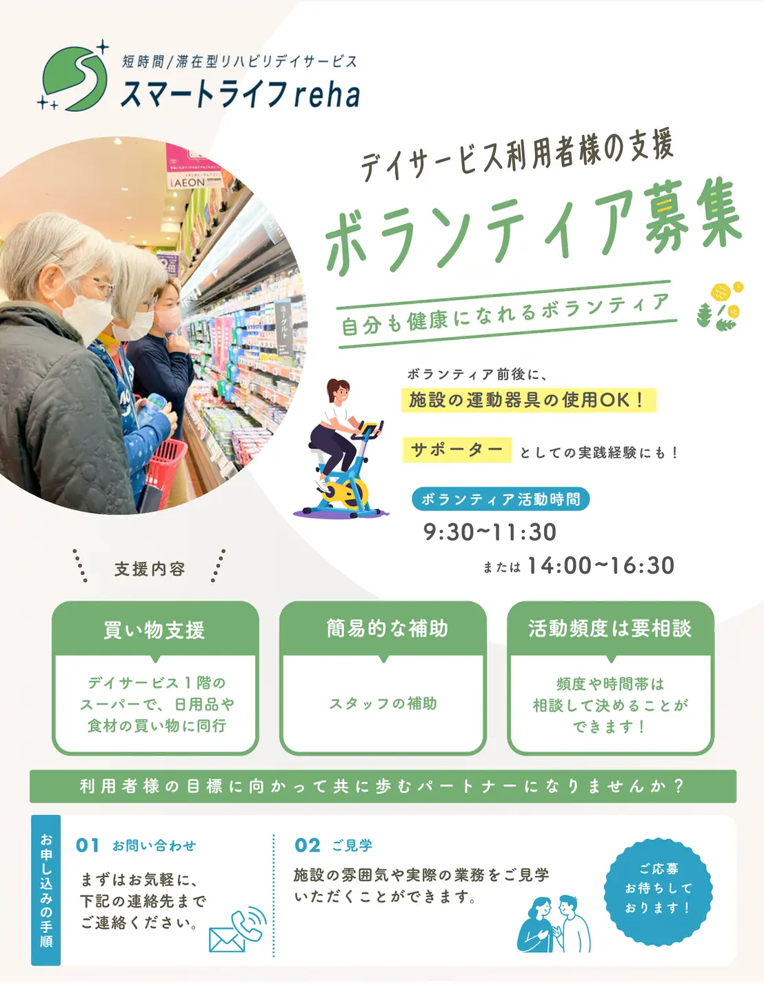 スマートライフrehaでは、デイサービス利用者様の活動を支えてくださるボランティアを募集しています。