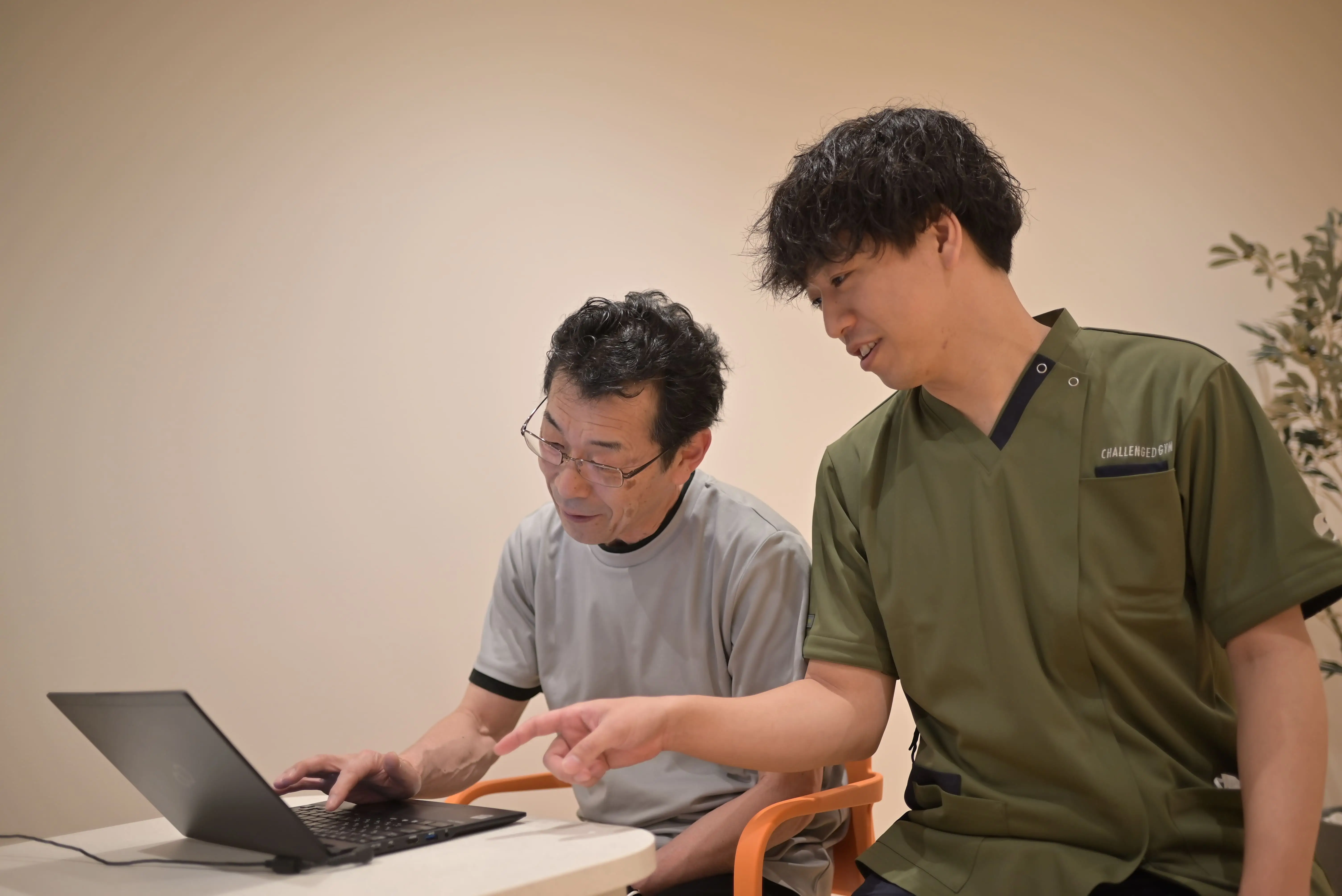 得られた評価をもとに、専門スタッフが障がいの状況や目標に応じた個別プログラムや自主トレーニングを作成します。課題の難易度を細かく調整しながらプログラムを立案することで、質の高いトレーニングの提供が可能です。さらに、定期的なヒアリングを通じて目標の達成度やお悩みを確認しながら、リハビリの進行状況を振り返ることで、段階的な取り組みと行動変容・習慣づくりをスタッフが継続的にサポートする体制を整えています。