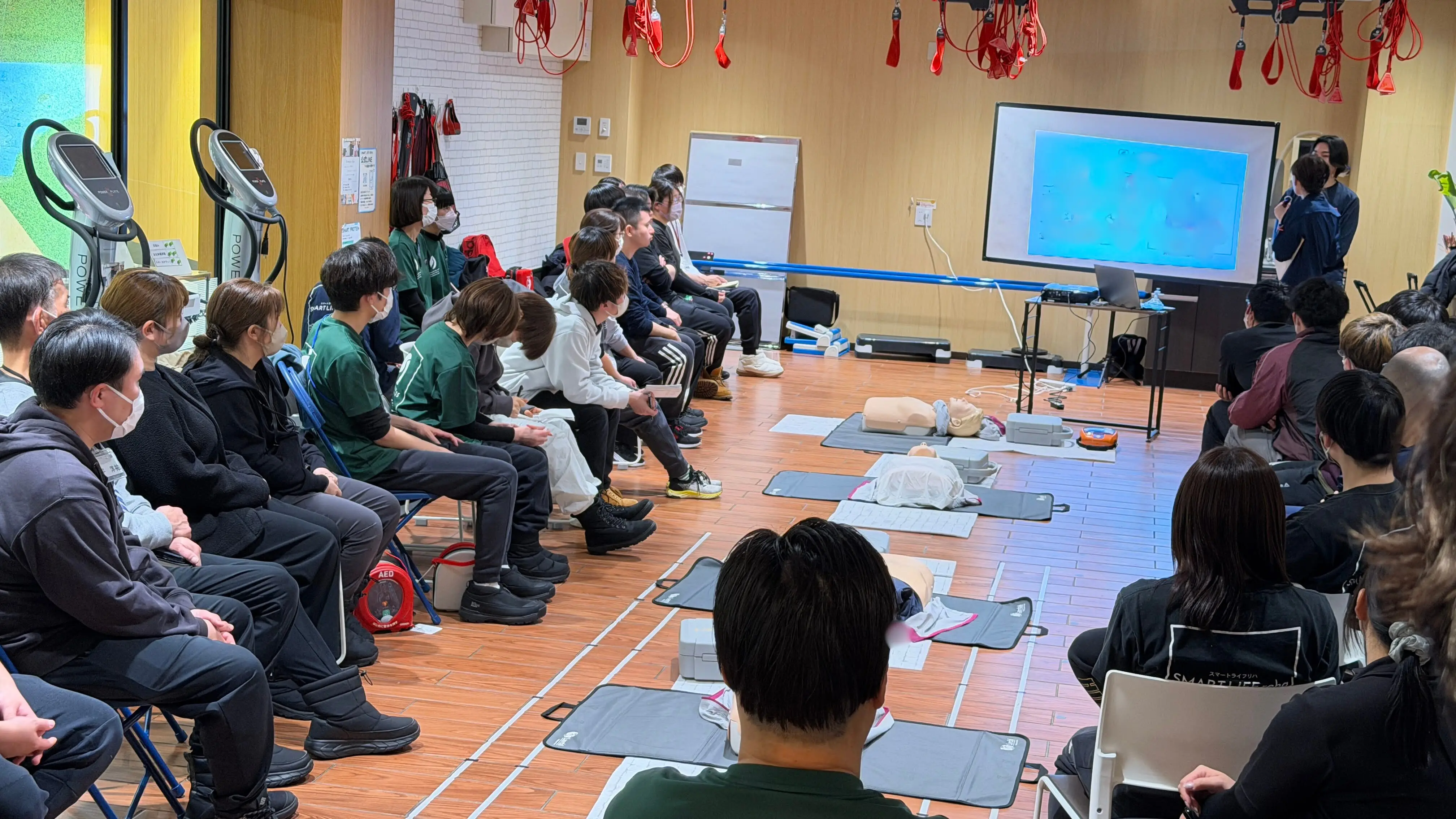 研修では、胸骨圧迫30回+人工呼吸2回の組み合わせも確認。特に子どものケースでは人工呼吸の重要性が強調されました。